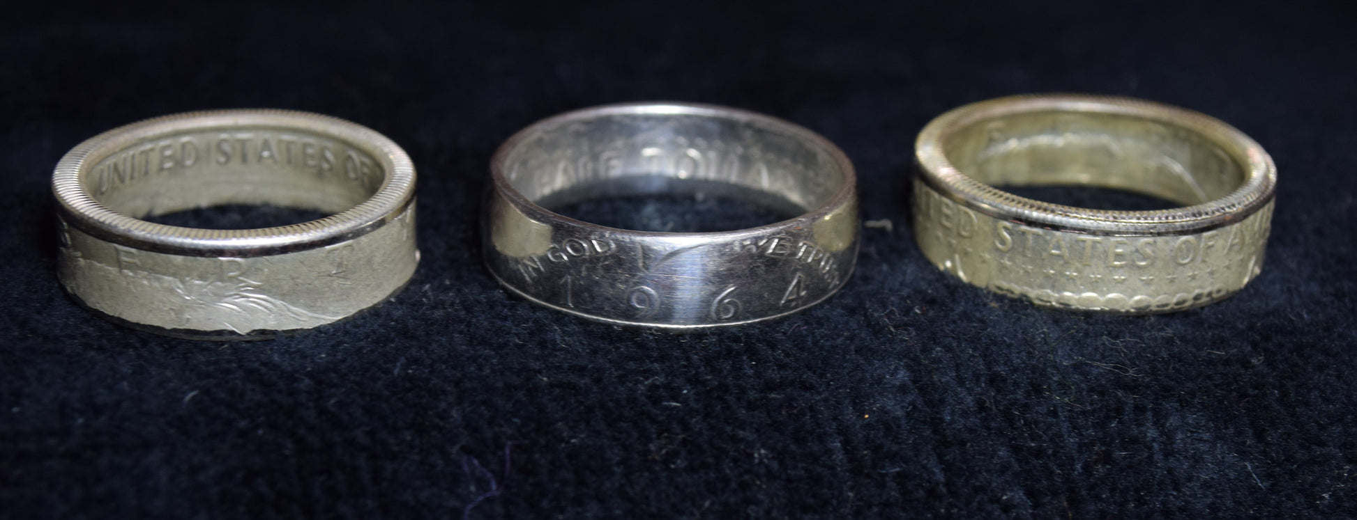 A ring made from pre 1965 silver half dollar coins. This ring is a thicker band and can be made with a straight walled look known as a Swedish wrap, or a fat tire look making it more rounded. This ring has wider band due to its thickness and is a great choice for larger sizes. This ring will be a random year pre-1965. Specific years can be chosen, please reach out through email and ask if we have a specific date. Due to circulation of coins, we don't always have every year available.